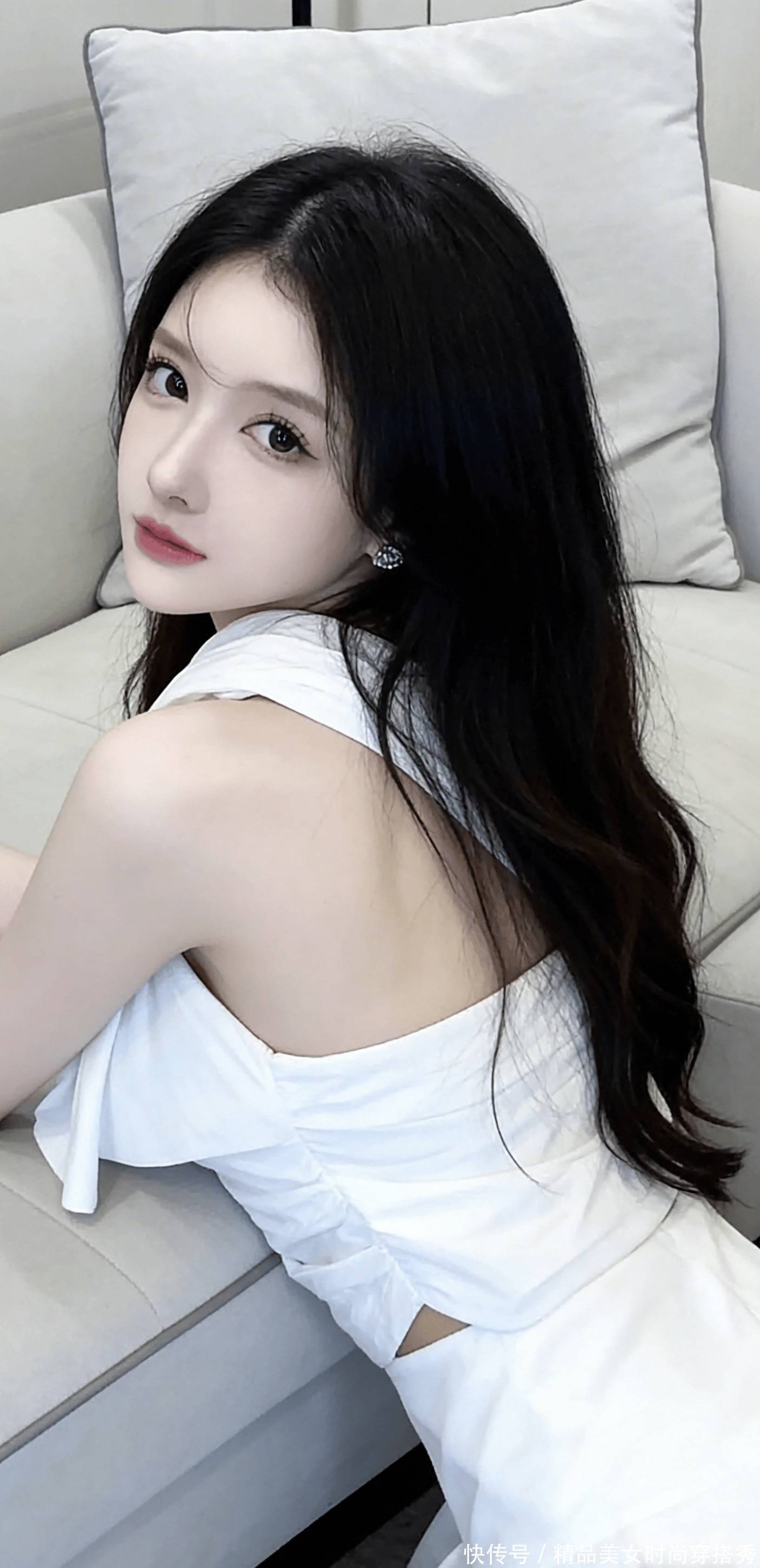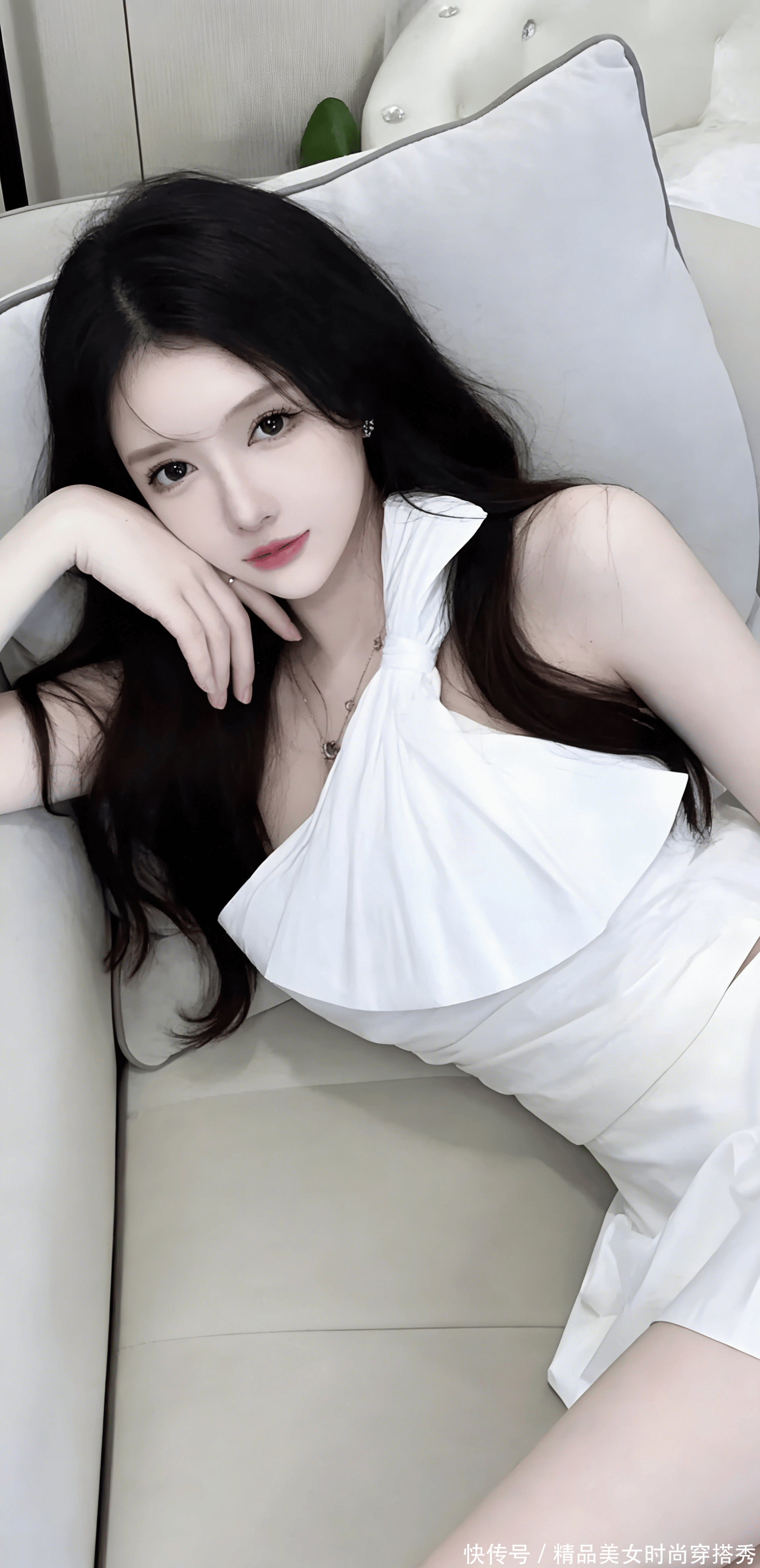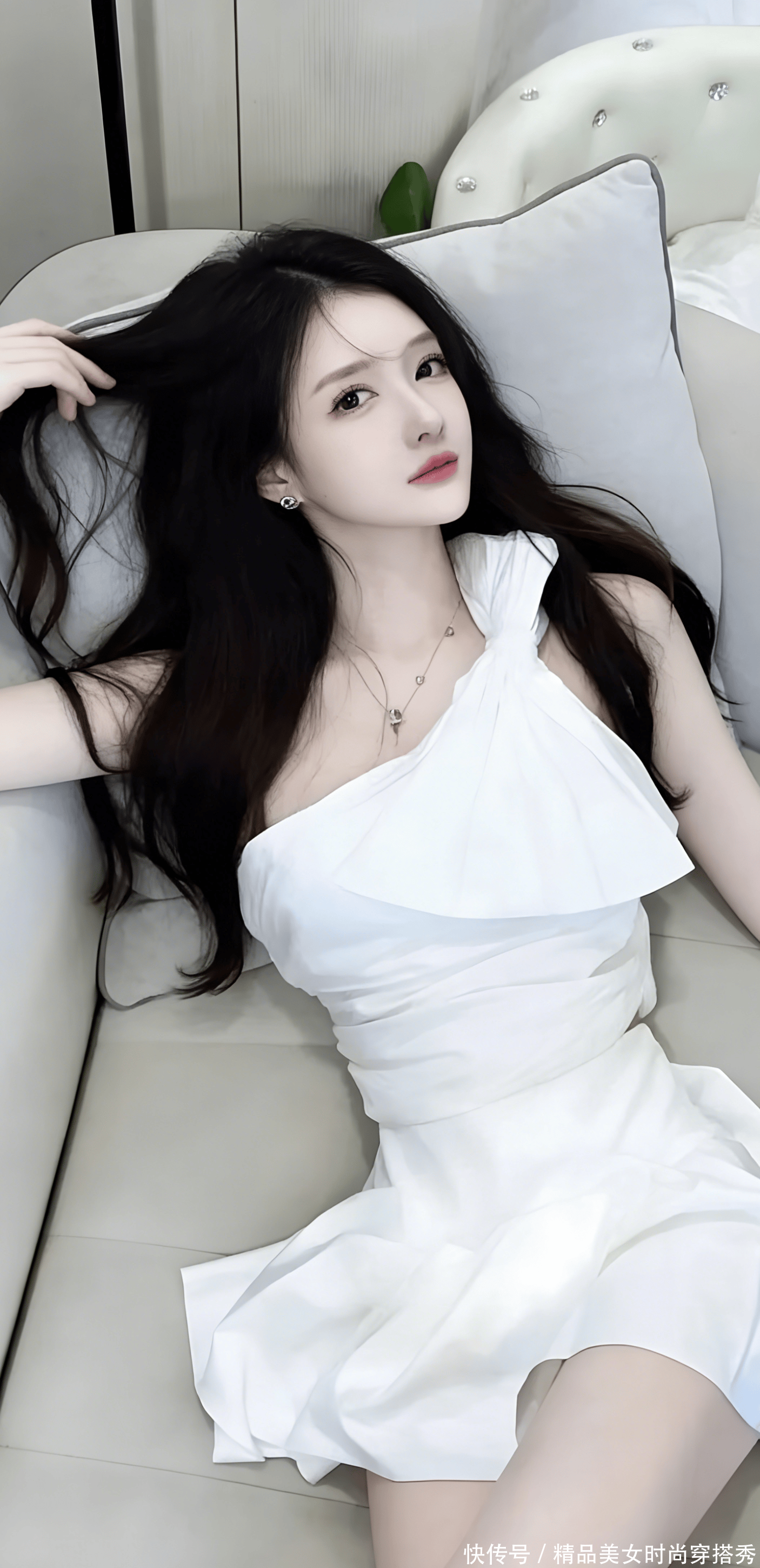 她就那样慵懒地陷在沙发里,白色单肩裙顺着肩线滑下来,露出半截白皙的肩,裙边刚好盖在大腿根,随着呼吸轻轻起伏,连布料的褶皱都藏着勾人的小心思。一只手搭在腰侧,指尖若有若无地蹭过布料,眼神抬起来的瞬间,比任何情话都管用 —— 她没说 “我等你”,可眼神里全是 “你怎么才来” 的娇嗔。